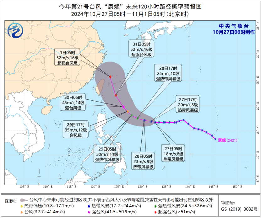 預(yù)計,“康妮”將以每小時10至15公里的速度向偏西方向移動。29日開始轉(zhuǎn)向西北方向移動,逐漸向臺灣島東部海面靠近,強(qiáng)度逐漸增強(qiáng),最強(qiáng)可達(dá)強(qiáng)臺風(fēng)級或超強(qiáng)臺風(fēng)級(48至55米/秒,15至16級)。