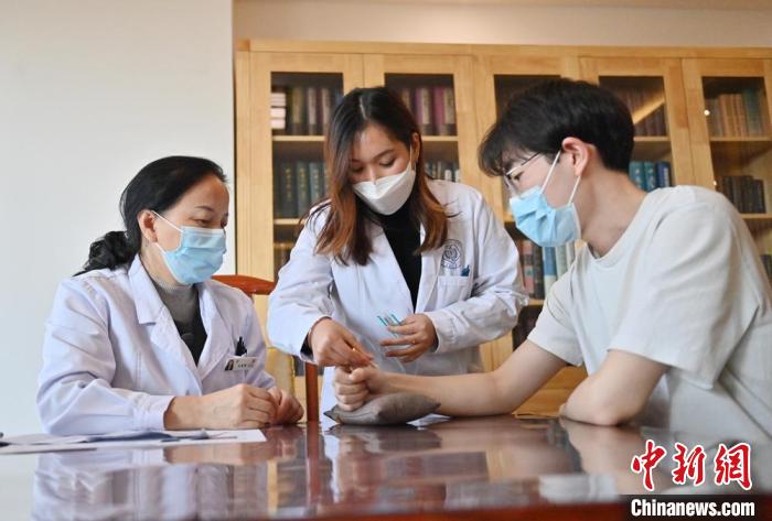 診室里,林玉花拿出針灸針,運用捻轉(zhuǎn)與提插等手法為患者針灸治病。經(jīng)過老師悉心指導(dǎo),這位“95后”泰國女孩已經(jīng)熟練掌握針灸、拔罐等中醫(yī)治療手段。