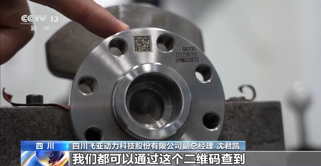 四川飛亞動力科技股份有限公司副總經(jīng)理 沈君凱:質(zhì)量的信息、技術(shù)的信息,甚至是當天生產(chǎn)產(chǎn)品設(shè)備的整個機器的型號、設(shè)備的狀態(tài),我們都可以通過這個二維碼查到。