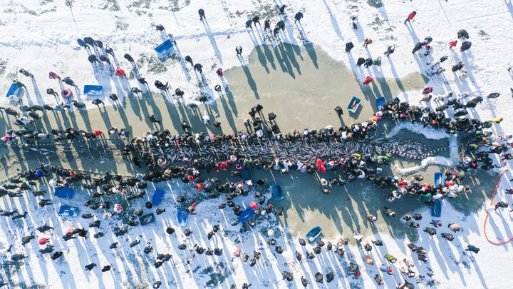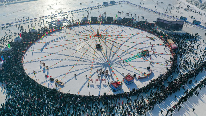 2023年12月28日,游客觀看查干湖冬捕“祭湖醒網(wǎng)”儀式(無(wú)人機(jī)照片)。新華社記者 張楠 攝