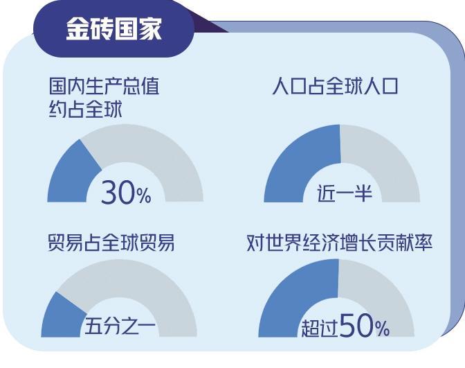 今年是“大金磚合作”開局之年。擴(kuò)員后,金磚國(guó)家國(guó)內(nèi)生產(chǎn)總值約占全球30%、人口占全球人口近一半、貿(mào)易占全球貿(mào)易五分之一,金磚成色更足、分量更重、潛能更大。