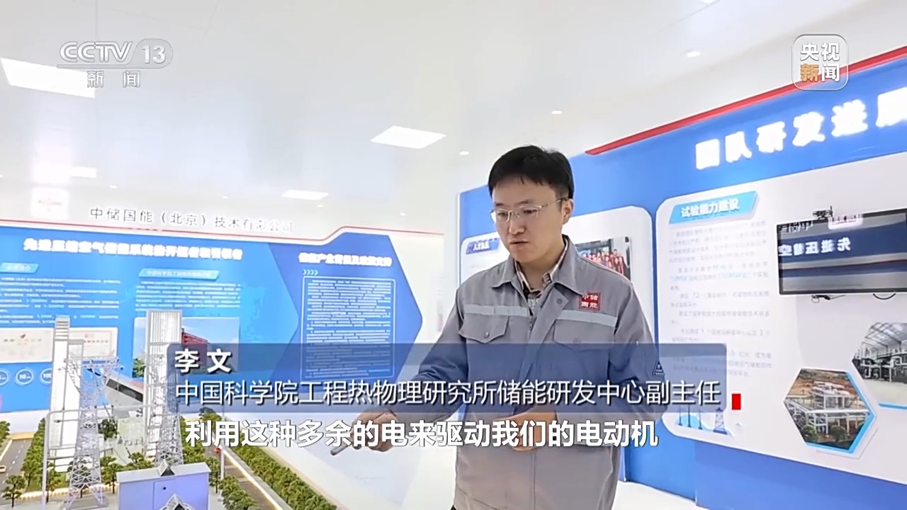中國科學(xué)院工程熱物理研究所儲能研發(fā)中心副主任 李文:利用多余的電來驅(qū)動電動機(jī),帶動壓縮機(jī)把空氣壓縮到高壓狀態(tài),最后存儲到儲氣裝置中,在有需要的時候,我們利用所存儲的高壓空氣來驅(qū)動膨脹機(jī),帶動發(fā)電機(jī)進(jìn)行做功發(fā)電。