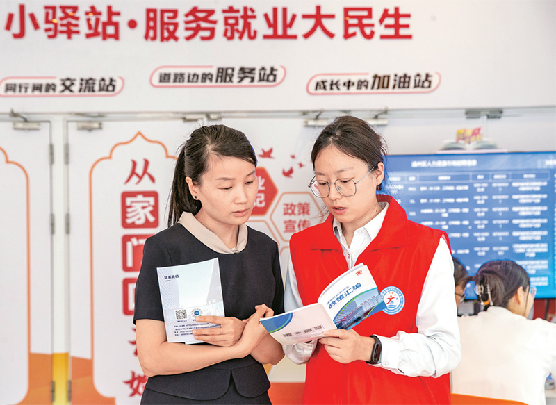 零工市場是向靈活就業(yè)人員與用工主體提供就業(yè)服務(wù)的重要載體。圖為2024年9月3日,江蘇省南通市通州區(qū)萬達(dá)廣場“零工驛站”內(nèi),就業(yè)服務(wù)人員在向求職者介紹就業(yè)創(chuàng)業(yè)政策。人民圖片 翟慧勇/攝