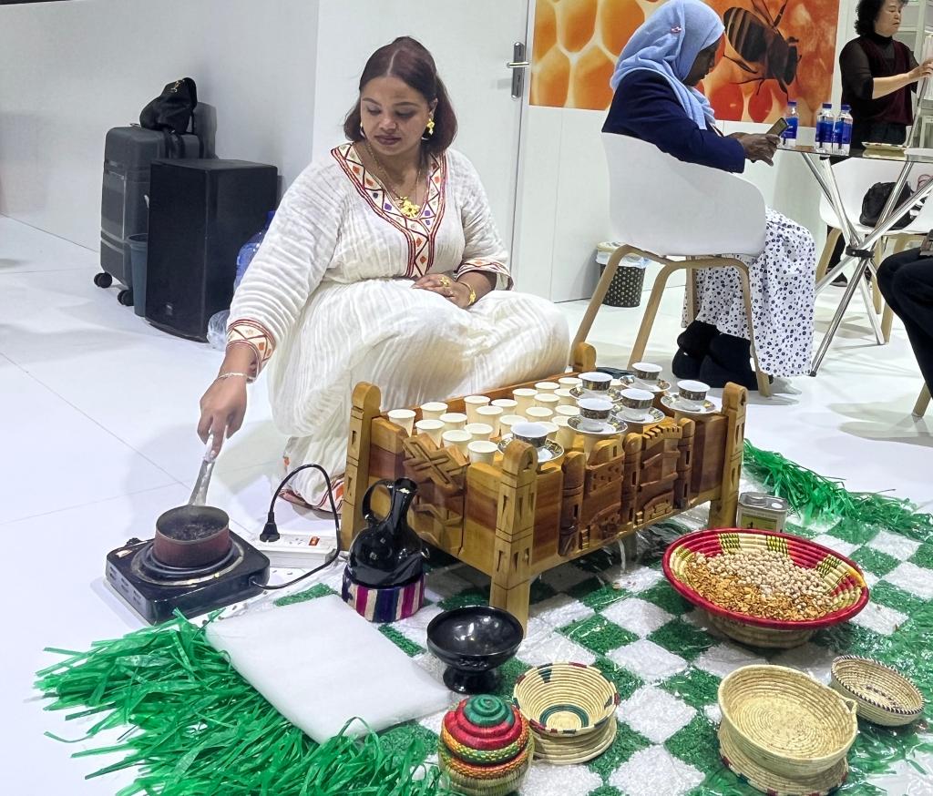 在埃塞俄比亞國(guó)家館展區(qū),埃塞俄比亞咖啡師在現(xiàn)場(chǎng)烘焙咖啡豆,展示當(dāng)?shù)乜Х任幕#ㄊ茉L(fǎng)者供圖)