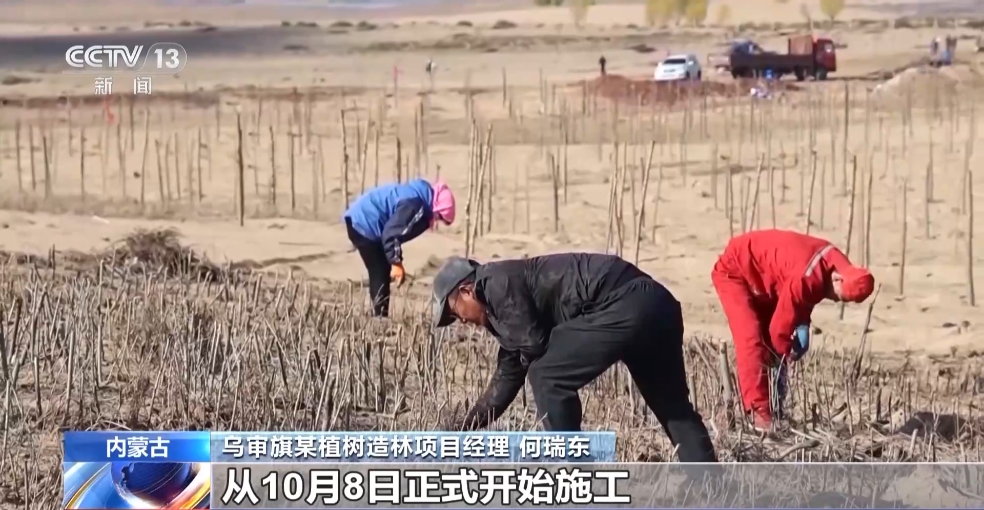 烏審旗某植樹造林項目經(jīng)理 何瑞東:挖樹坑嚴(yán)格保證至少在1米,保證種植深度,及時澆水,保證每棵樹都要種到位、澆到位。從10月8日正式開始施工,總占地治理面積是3225畝。