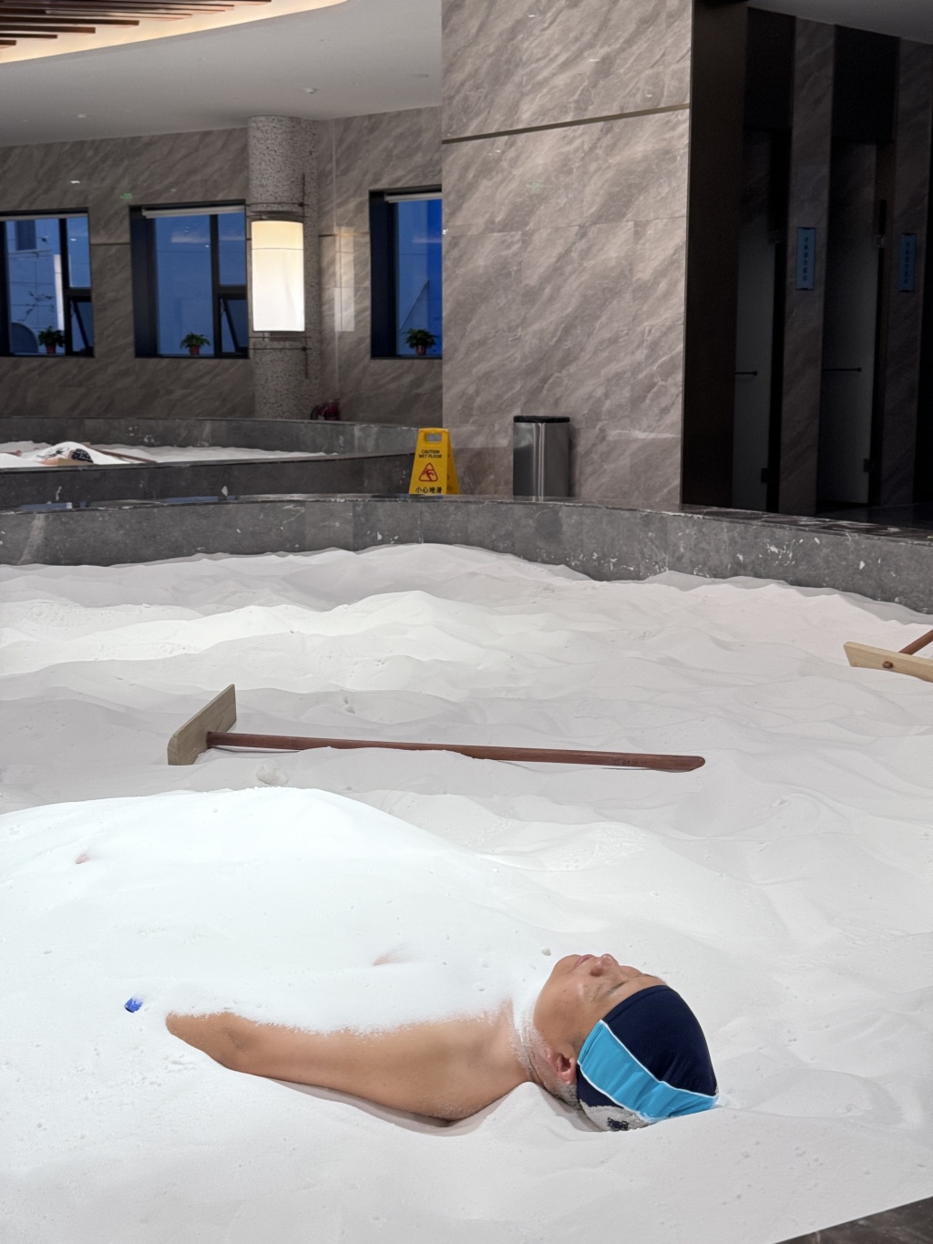 一位游客正在進(jìn)行礦鹽理療,通過(guò)礦鹽覆蓋全身以達(dá)到促進(jìn)血液循環(huán)、疏通經(jīng)絡(luò)的作用。 澎湃新聞?dòng)浾?金向玉 攝