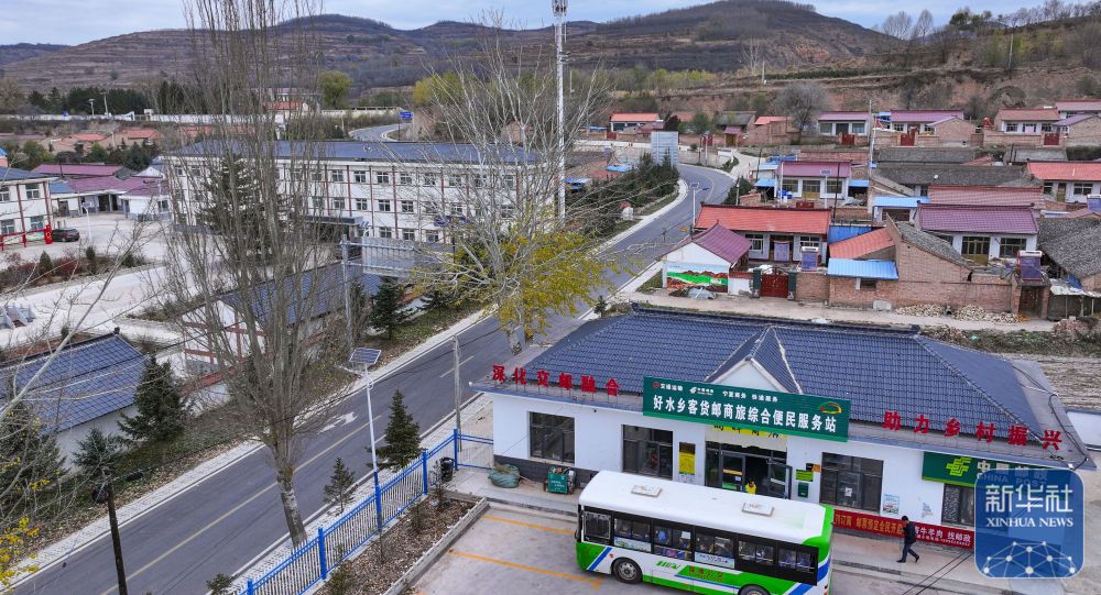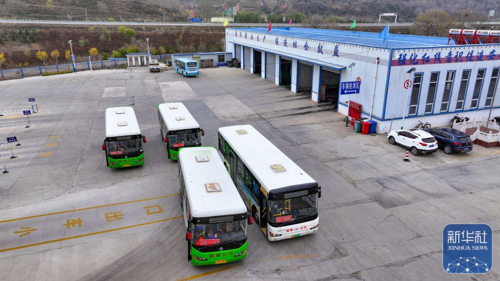 載有快遞物品的城鄉(xiāng)公交車(chē)即將從隆德縣公交公司駛出(11月9日攝,無(wú)人機(jī)照片)。