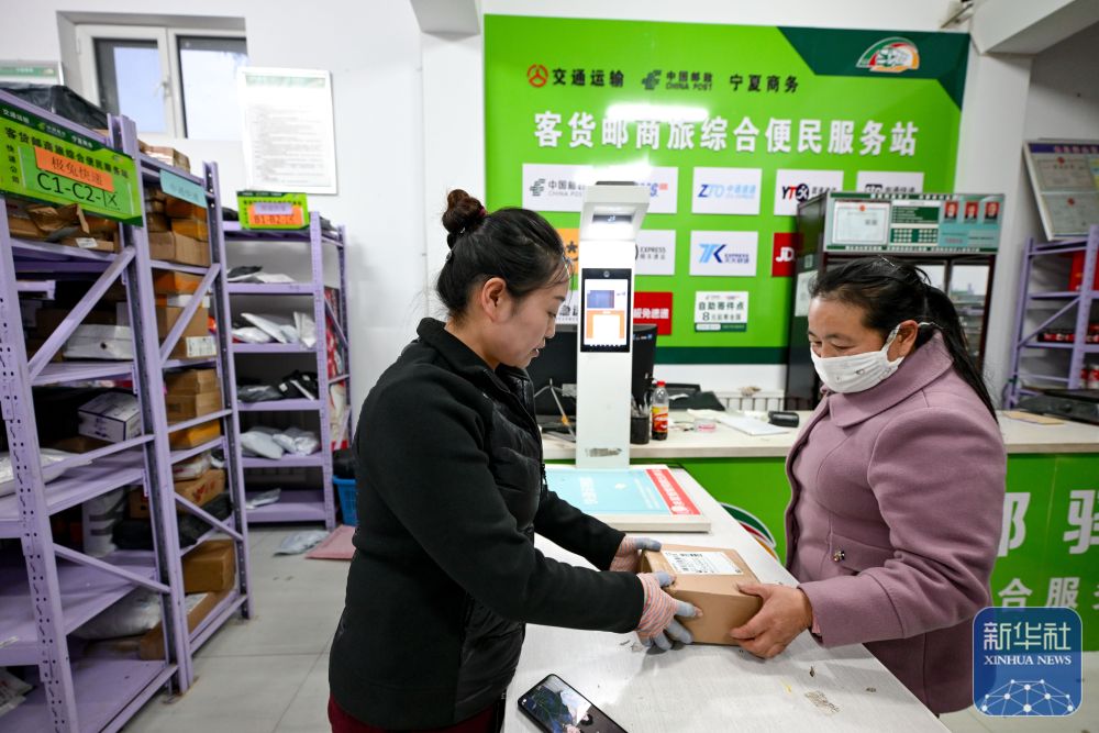 11月10日,村民景文仙在隆德縣奠安鄉(xiāng)梁堡村快遞服務(wù)點(diǎn)取快遞。
