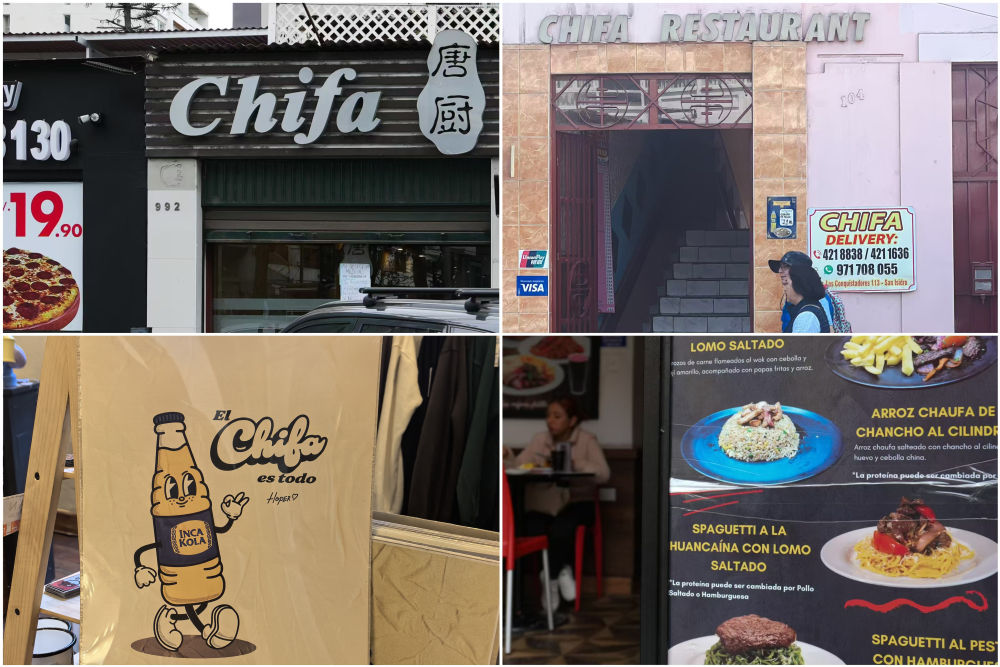 綿延不斷的人文交流,讓秘魯?shù)娘嬍硯狭嗣黠@的中餐印記:中餐館在秘魯被稱作“Chifa”(吃飯)(左上、右上)。炒飯(Chaufa)作為常規(guī)食物,登上了大多數(shù)當?shù)夭宛^的菜單(右下)。Chifa一詞,還被利馬的年輕畫家化用為文化符號,與本土飲料“印加可樂”一起融入到藝術創(chuàng)作中(左下)。