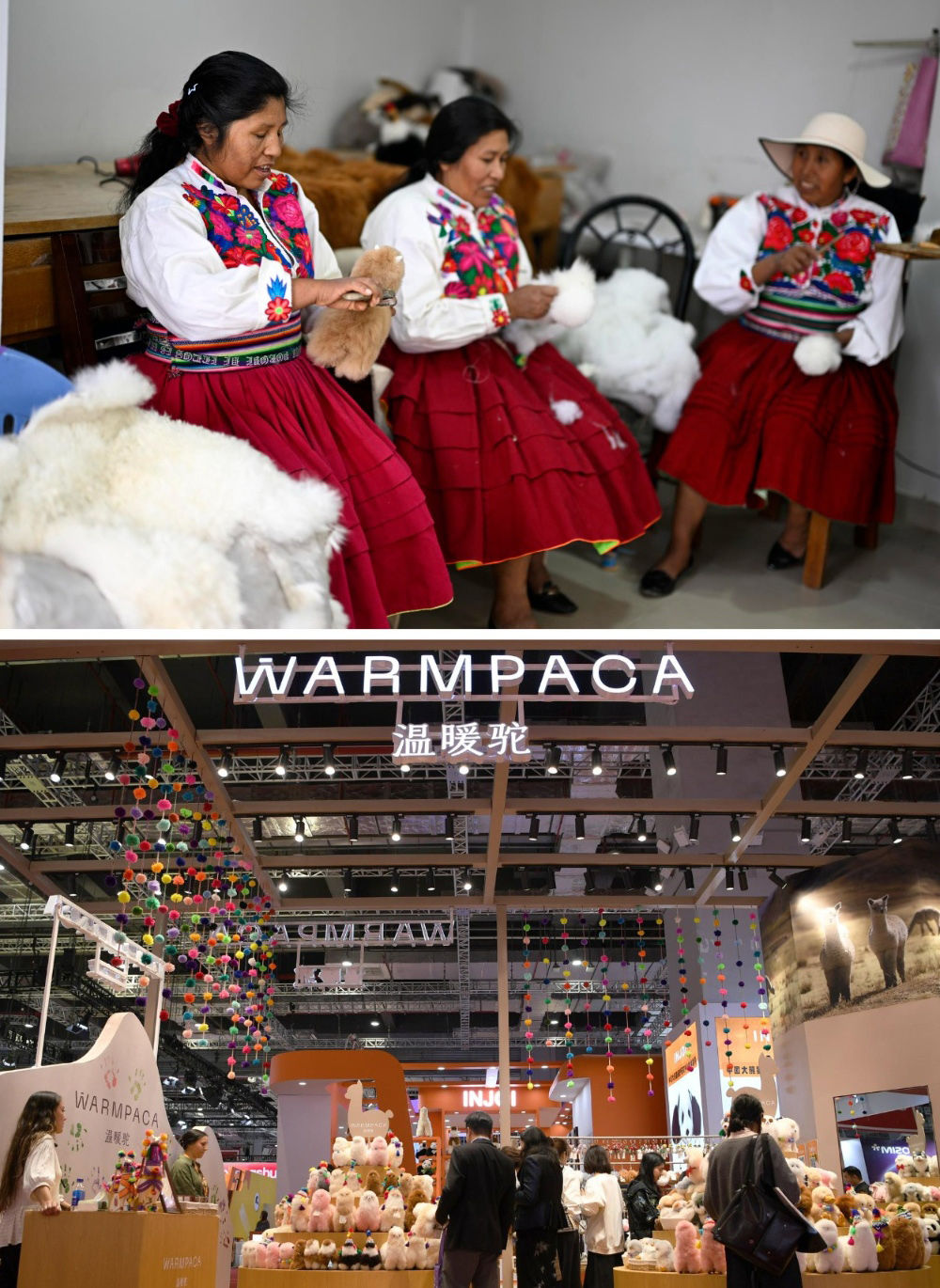 2016年,中國姑娘馬玉霞在秘魯阿雷基帕街邊市場購買了秘魯羊駝毛制品手工藝人奧斯瓦爾多·馬馬尼的羊駝毛玩偶并引入中國市場。通過連續(xù)參展進博會,羊駝毛制品在中國市場大受歡迎,并創(chuàng)立了中文品牌“溫暖駝”。今年,秘魯品牌“溫暖駝”連續(xù)第七年亮相進博會,受到更多中國消費者的喜愛。目前,“溫暖駝”品牌已入駐國內(nèi)30多家商場,并且開拓了電商平臺線上銷售,年銷量超過3萬只。上圖:2024年6月20日,在秘魯阿雷基帕,工作人員在羊駝毛制品手工藝人奧斯瓦爾多·馬馬尼的工坊制作羊駝玩偶。下圖:2024年11月5日在上海拍攝的第七屆進博會秘魯“溫暖駝”展臺。
