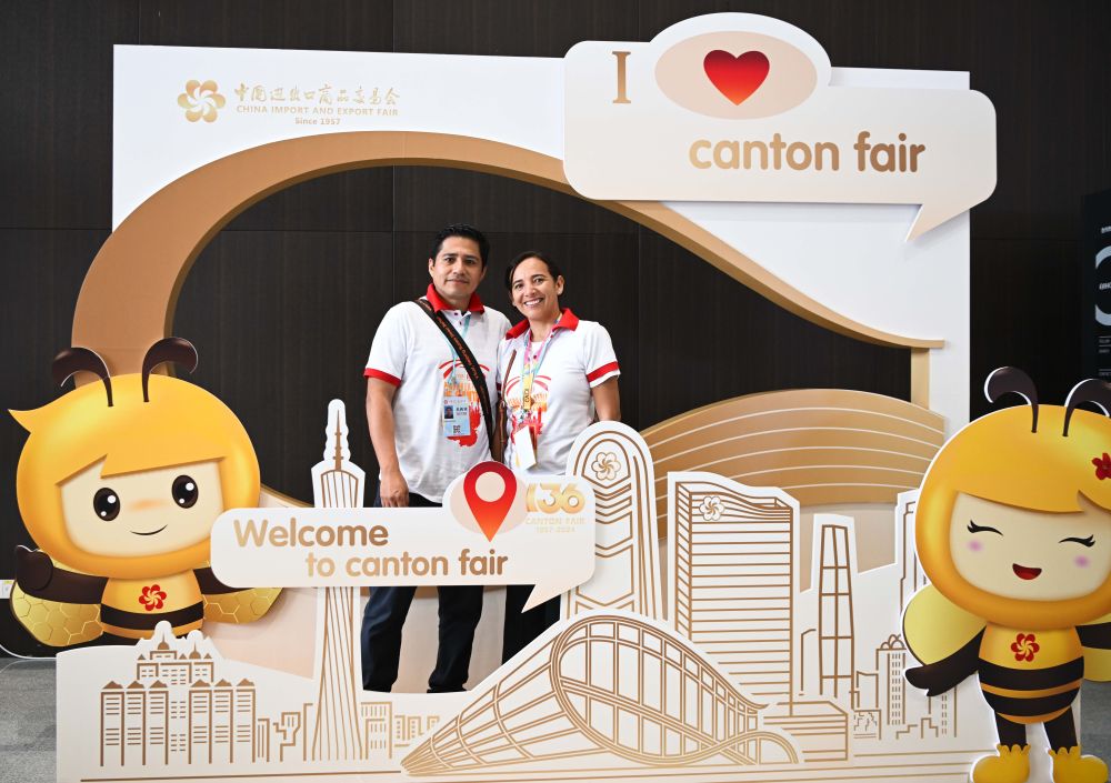 2024年10月15日,來自秘魯?shù)牟少徤淘趶V州舉行的廣交會上合影留念。