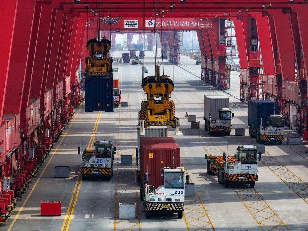 江蘇省蘇州港太倉港區(qū)集裝箱碼頭,集裝箱吞吐作業(yè)繁忙(無人機(jī)照片,10月10日攝)。新華社記者 李博 攝
