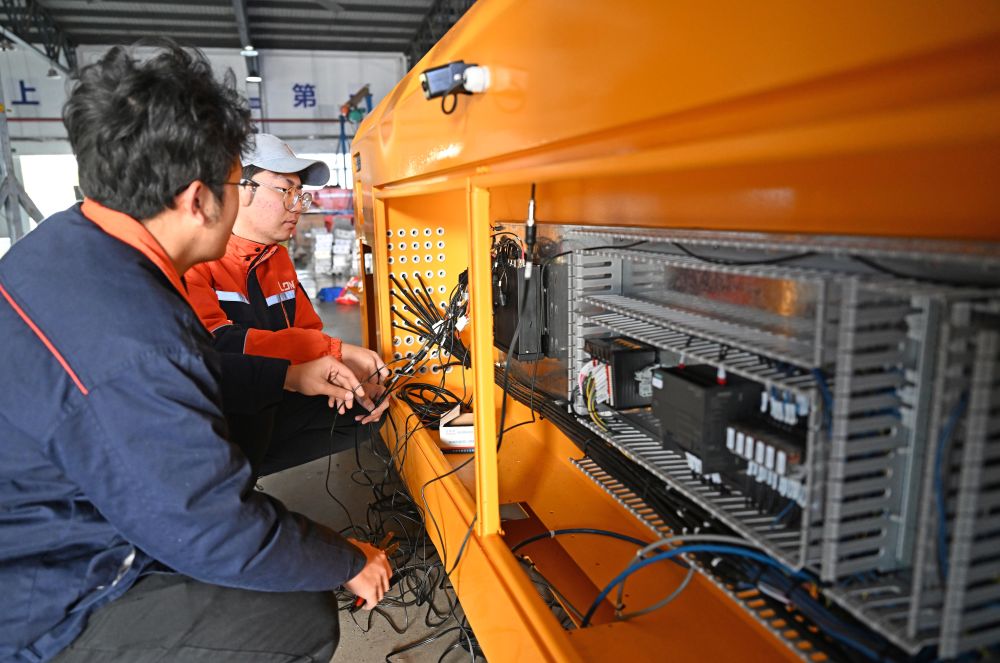 在位于天津市西青區(qū)的天津朗譽機器人有限公司生產(chǎn)車間內(nèi),工作人員在調(diào)試重載自動導引運輸車。新華社記者 趙子碩 攝