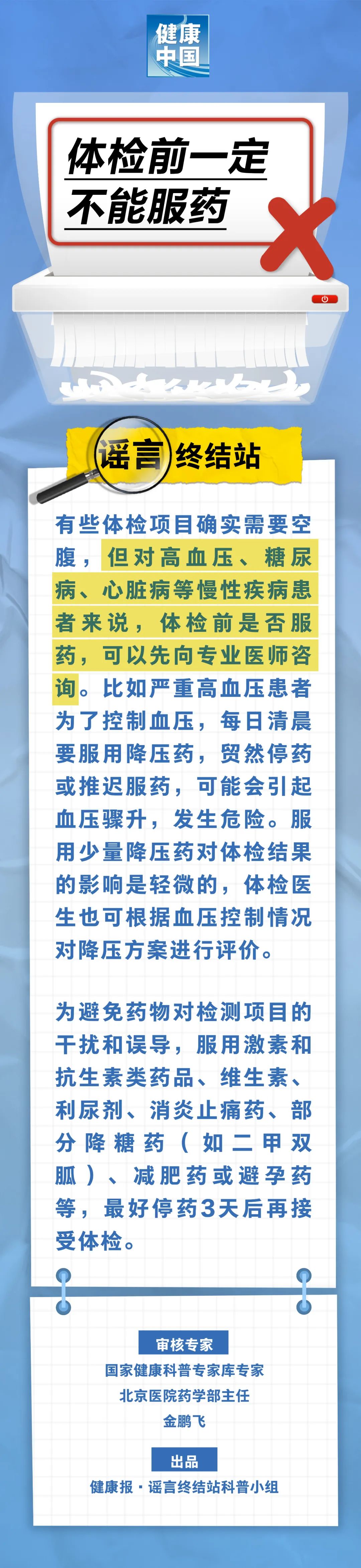 體檢前是否服藥要根據(jù)服用的藥物和檢查目的而定。比如,降壓藥可以按照正常服藥時間服完后再進(jìn)行體檢,避免造成血壓波動過大,還可同時評估降壓藥物的治療效果;而有些需要隨餐服用的降糖藥則不應(yīng)空腹服用,一般建議隨身攜帶降糖藥,待完成空腹項(xiàng)目后進(jìn)餐時服用,這樣既保證了服藥效果,又檢測了真實(shí)的空腹血糖。