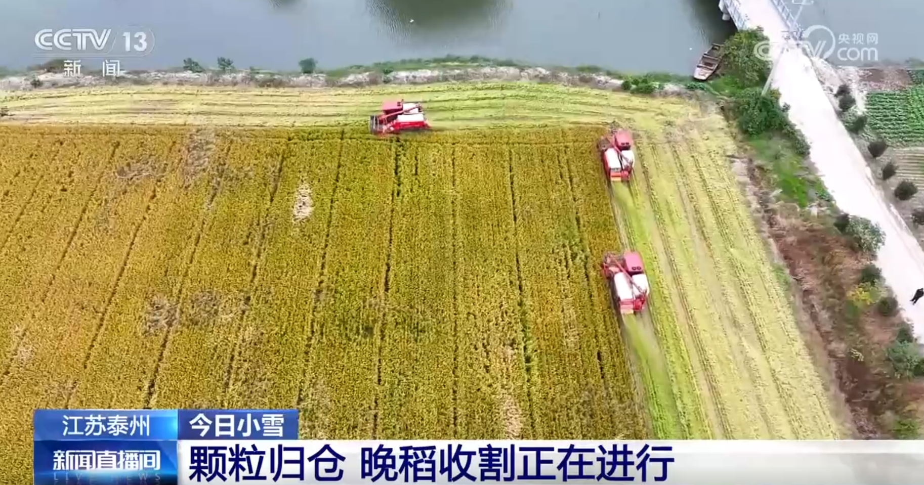 我們現(xiàn)在看到的是江蘇泰州正在進(jìn)行的晚稻收割作業(yè)。這個時候,當(dāng)?shù)卦绲竞椭械疽呀?jīng)收獲完成,收割機(jī)正開足馬力進(jìn)行晚稻收獲,割穗、脫粒、粉碎秸稈,一氣呵成,連倒伏的稻穗也被采收干凈,金黃飽滿的稻谷順著管道傾瀉而下,顆粒歸倉。