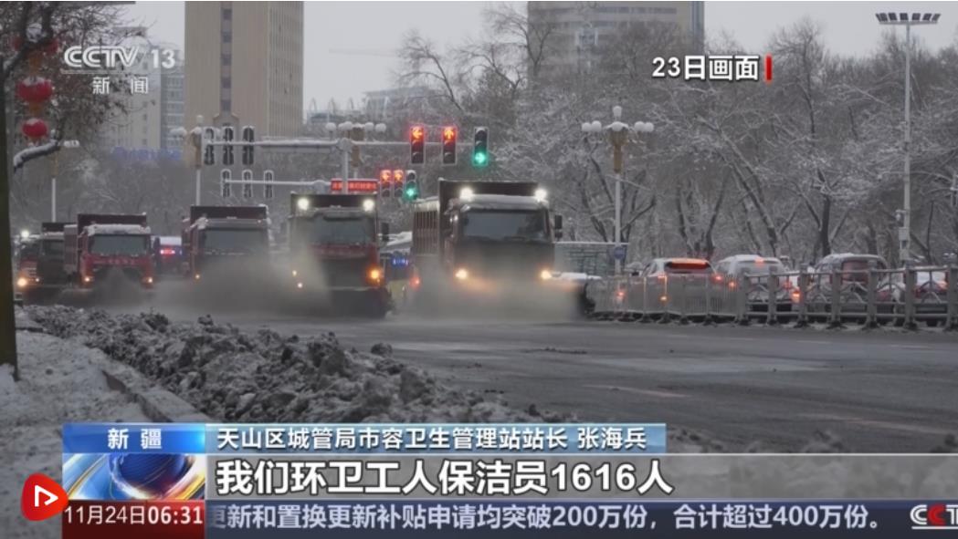 11月22日下午到11月23日16時(shí),烏魯木齊迎來降雪,最大積雪深度達(dá)20厘米。城管部門連夜作業(yè),快速出動(dòng)大型清雪車輛和環(huán)衛(wèi)工人進(jìn)行清雪。