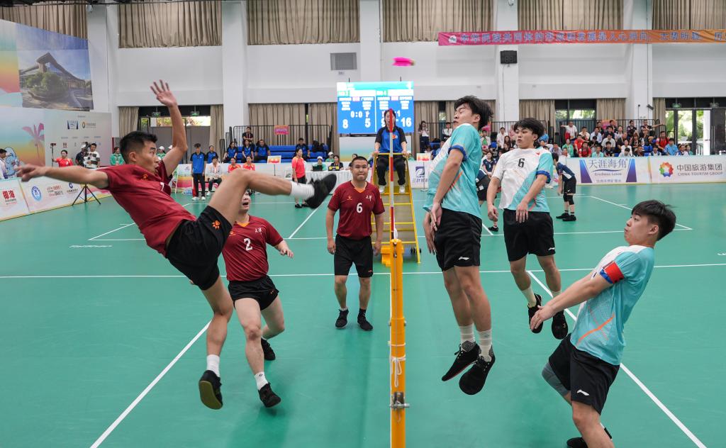 23日,第十二屆全國(guó)少數(shù)民族傳統(tǒng)體育運(yùn)動(dòng)會(huì)(以下簡(jiǎn)稱“運(yùn)動(dòng)會(huì)”)毽球項(xiàng)目在海南三亞中瑞酒店管理職業(yè)學(xué)院開賽,斗志昂揚(yáng)的西藏隊(duì)與沉穩(wěn)老練的香港隊(duì)在男子三人小組賽中相遇。頭球、倒鉤球、掃堂腿、腳底扣球絕殺……雙方你追我趕,觀眾看得目不轉(zhuǎn)睛。
