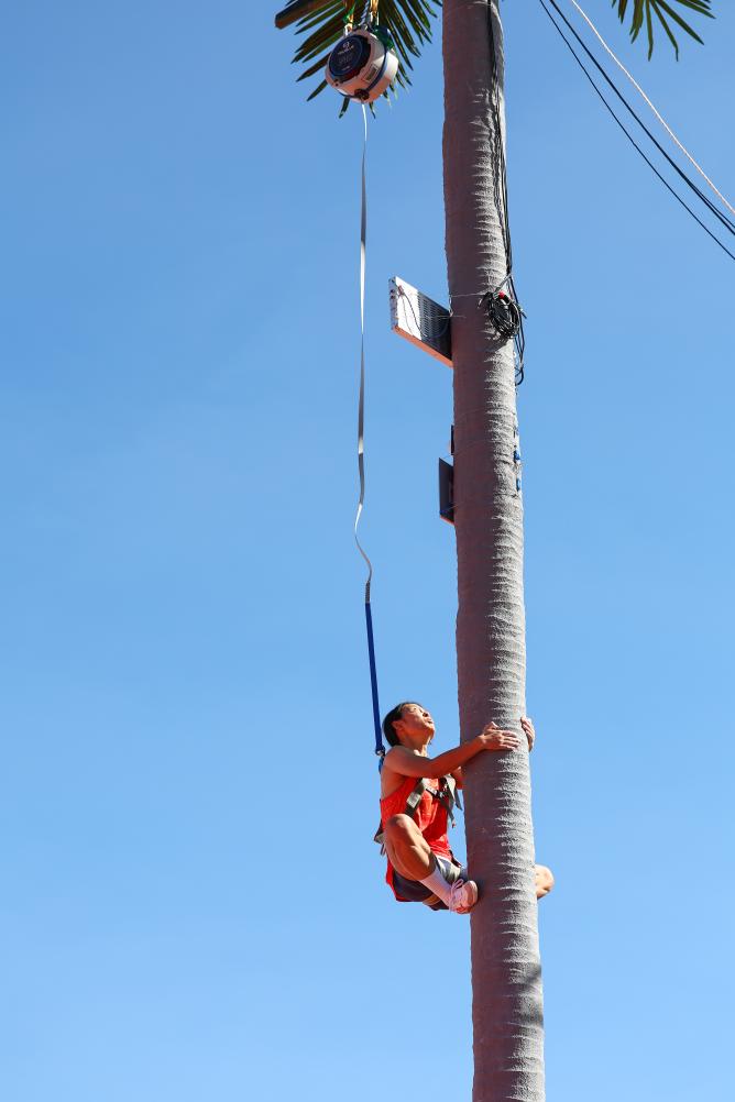 這項(xiàng)起源于海南群眾摘椰勞作的比賽既像沒有巖點(diǎn)的速度攀巖,又像垂直騰躍的跑酷。比賽中,運(yùn)動(dòng)員在9米(女子7米)的人造椰樹上攀爬,“樹干”筆直,六七秒之間便已決出勝負(fù),扣人心弦的比賽令觀眾發(fā)出潮水般的歡呼。