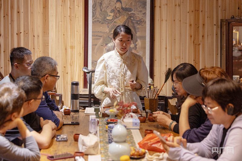 在倒扒獅街,“90后”安慶姑娘秦?zé)o顏是一家文化主題會(huì)館的主理人。在她的會(huì)館里,檀木、玉石等制作而成的新中式文玩飾品、傳統(tǒng)工藝面料制作而成的“新中式”服裝、古色古香的“新中式”茶館,定期舉行的雅集活動(dòng)……無(wú)一不體現(xiàn)著獨(dú)特的東方美學(xué)。2020年,在上海從事珠寶設(shè)計(jì)工作的她返回家鄉(xiāng)經(jīng)營(yíng)起這家文化空間。“既逐新,也尋根?!彼M腿藖?lái)到這里,放慢腳步,在交流與體驗(yàn)中感受傳統(tǒng)文化的魅力,豐富精神體驗(yàn)。