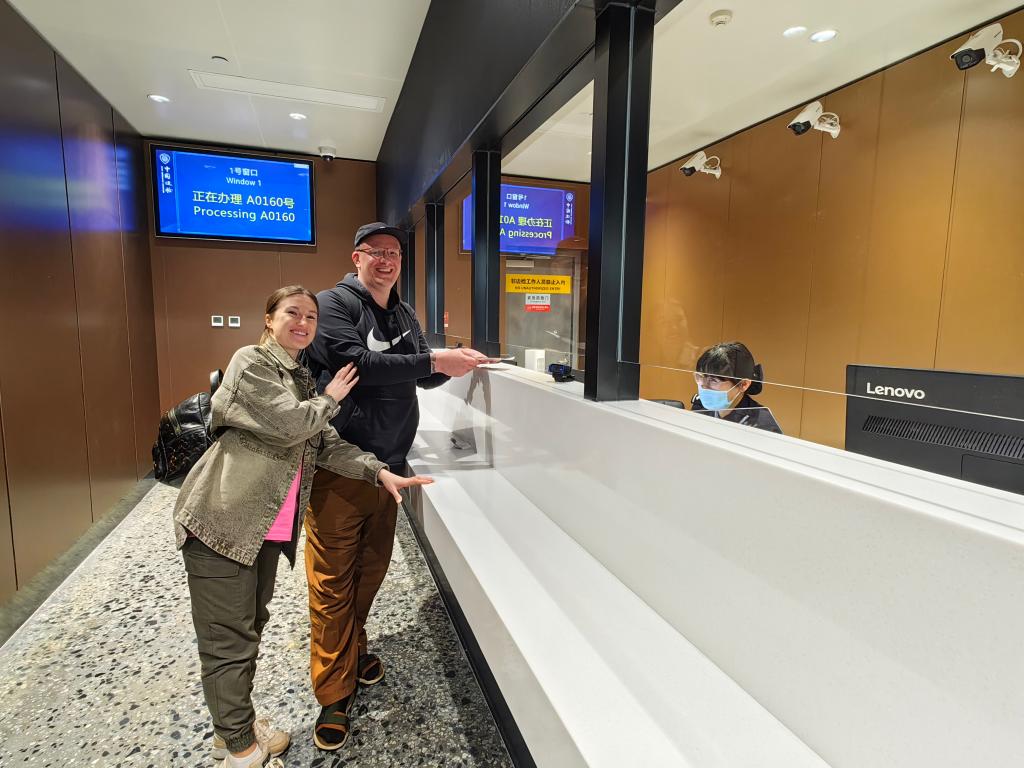 11月24日,正在辦理144小時過境免簽手續(xù)的俄羅斯旅客。(北京大興機(jī)場邊檢站供圖)