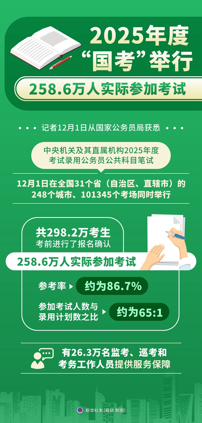 新華社北京12月1日電 記者1日從國家公務(wù)員局獲悉,中央機(jī)關(guān)及其直屬機(jī)構(gòu)2025年度考試錄用公務(wù)員公共科目筆試1日在全國31個(gè)省(自治區(qū)、直轄市)的248個(gè)城市、101345個(gè)考場同時(shí)舉行,共298.2萬考生考前進(jìn)行了報(bào)名確認(rèn)、258.6萬人實(shí)際參加考試,參考率約為86.7%,參加考試人數(shù)與錄用計(jì)劃數(shù)之比約為65:1,有26.3萬名監(jiān)考、巡考和考務(wù)工作人員提供服務(wù)保障。
