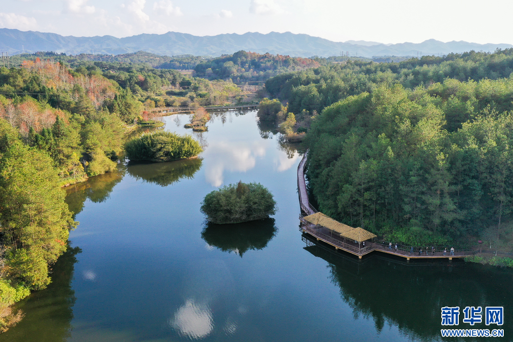 這是長汀汀江國家濕地公園一隅。經(jīng)過30多年的生態(tài)治理,昔日水土流失重災(zāi)區(qū)已成為風(fēng)光秀麗、林果連片的生態(tài)旅游勝地(無人機照片)。