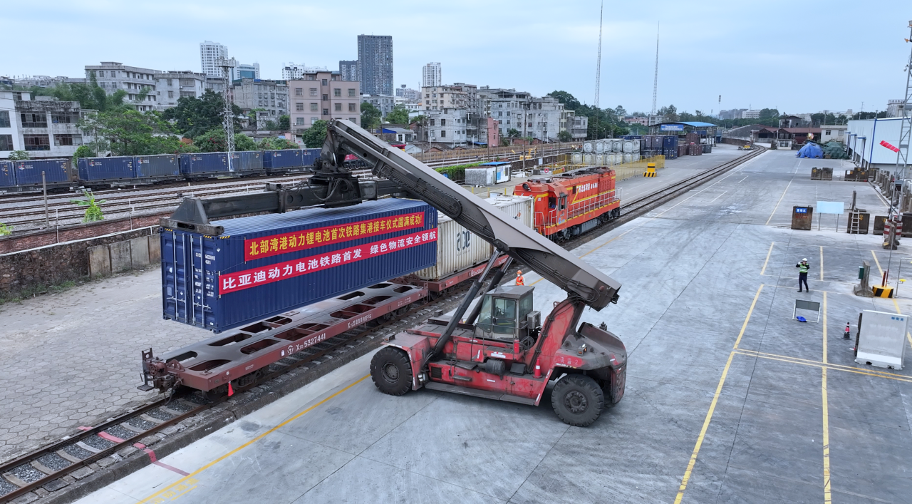 11月19日,一列載著比亞迪新能源動力鋰電池的列車,從重慶長壽區(qū)渝巴專用鐵路發(fā)車,沿著西部陸海新通道南下,于22日駛入廣西北部灣防城港新宏光鐵路專用線。隨著接卡作業(yè)的完成,全國首次鐵路發(fā)運動力鋰電池在北部灣港順利接卸。