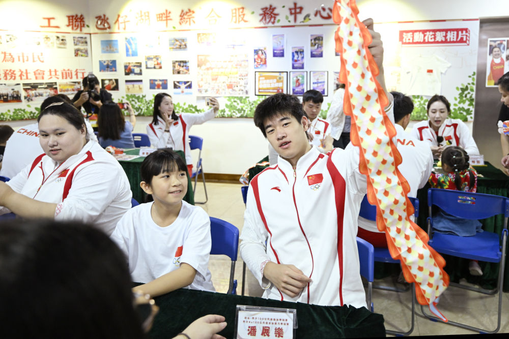 9月2日,在澳門工聯(lián)氹仔湖畔綜合服務中心,游泳運動員潘展樂(右)展示與小朋友一起制作的燈籠。新華社發(fā)
