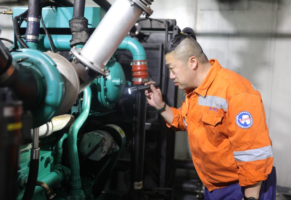 作為發(fā)電班班長,張冬的主要職責是確保柴油發(fā)電機組正常運轉,為考察站輸送穩(wěn)定持續(xù)的電力?!鞍l(fā)電棟24小時需要有人值守,我們三個人兩班倒,每個班次12小時?!睆埗f,“值班時每兩小時巡查一次,檢查發(fā)電機組是否有安全隱患?!?/p>