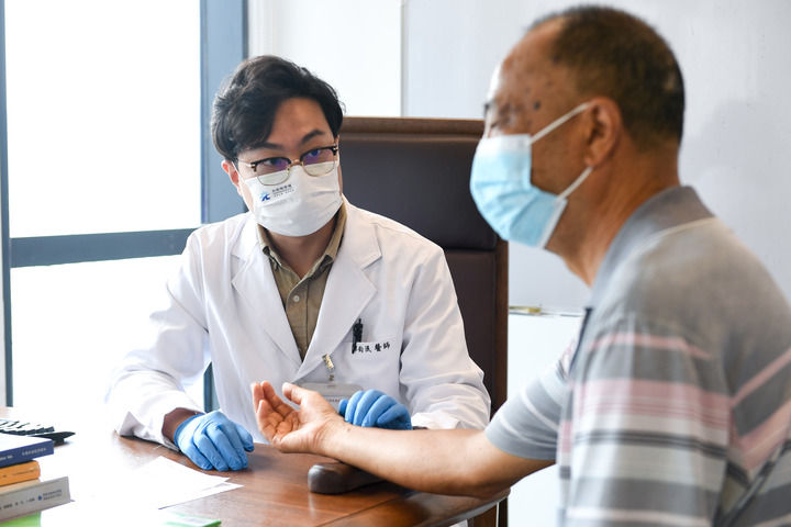 來(lái)自香港的注冊(cè)中醫(yī)師郭鈞泯(左)在深圳市中醫(yī)藥傳承發(fā)展研究院為病人看診(2023年9月4日攝)。新華社記者 毛思倩 攝
