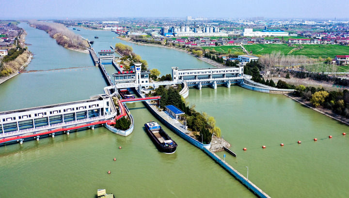 位于江蘇省揚(yáng)州市江都區(qū)的南水北調(diào)東線一期工程運(yùn)鹽閘、邵仙套閘、邵仙閘洞(2024年3月19日攝,無人機(jī)照片)。新華社發(fā)(任飛攝)