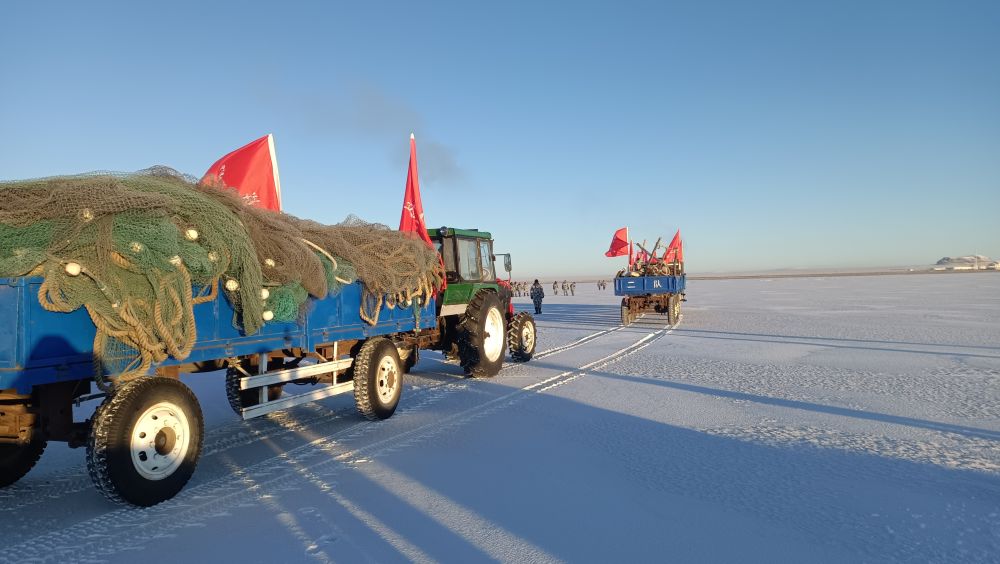 “2025年達(dá)里湖冬捕今日開(kāi)網(wǎng),弟兄們,鳴喜炮,出發(fā)!”22日一大早,伴隨著響亮的鞭炮聲,內(nèi)蒙古赤峰市克什克騰旗達(dá)里湖正式拉開(kāi)了一年一度的冬季捕魚(yú)序幕。70多名漁業(yè)工人身著厚厚的棉大衣,分成三支隊(duì)伍,乘坐拖拉機(jī)浩浩蕩蕩地奔赴達(dá)里湖。