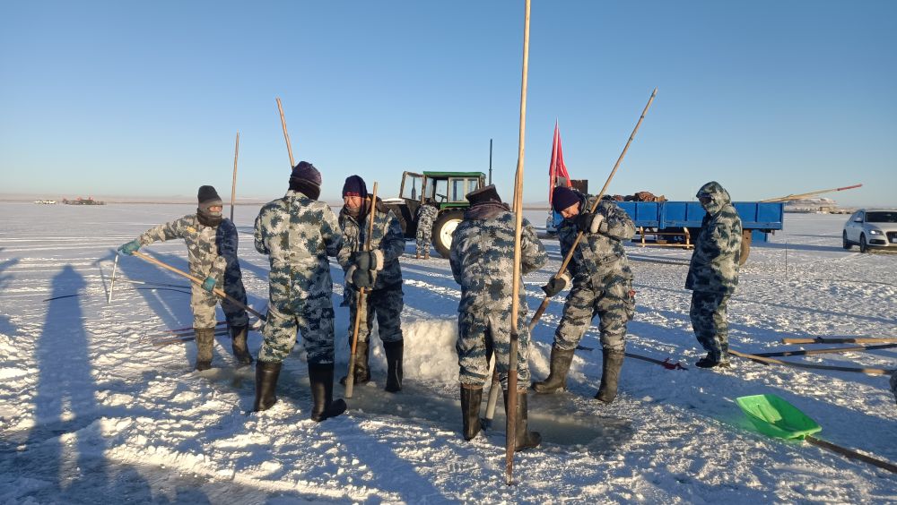 遼闊的達(dá)里湖銀裝素裹,在零下二十?dāng)z氏度左右的嚴(yán)寒中,漁業(yè)工人們開(kāi)始了一系列精細(xì)而有序的冬捕作業(yè)準(zhǔn)備工作。