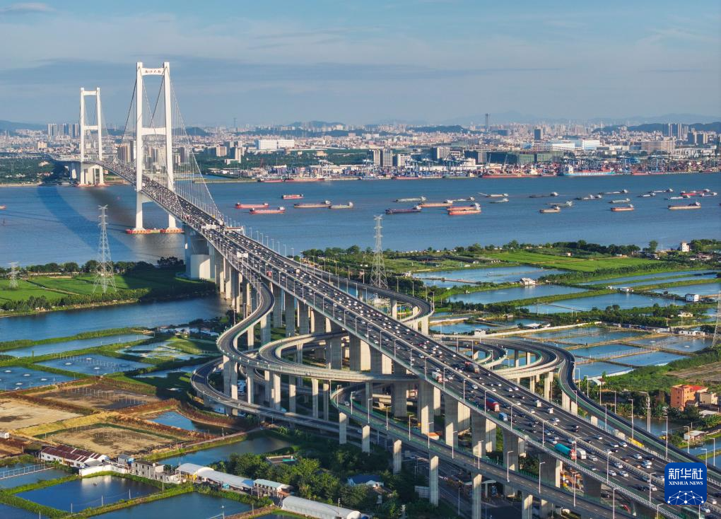 南沙大橋上的車流和獅子洋水道的船舶來來往往(2024年10月2日攝,無人機(jī)照片)。