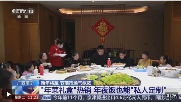 在廣西南寧,很多餐廳都開(kāi)始了“年夜飯預(yù)訂”,并且在線上推出了“年菜禮盒”“年夜飯外賣(mài)大禮包”多款套餐,菜品特色主要以南寧本地菜為主,商家還能根據(jù)顧客的“私人定制”,對(duì)年夜飯?zhí)撞偷牟似愤M(jìn)行調(diào)整。