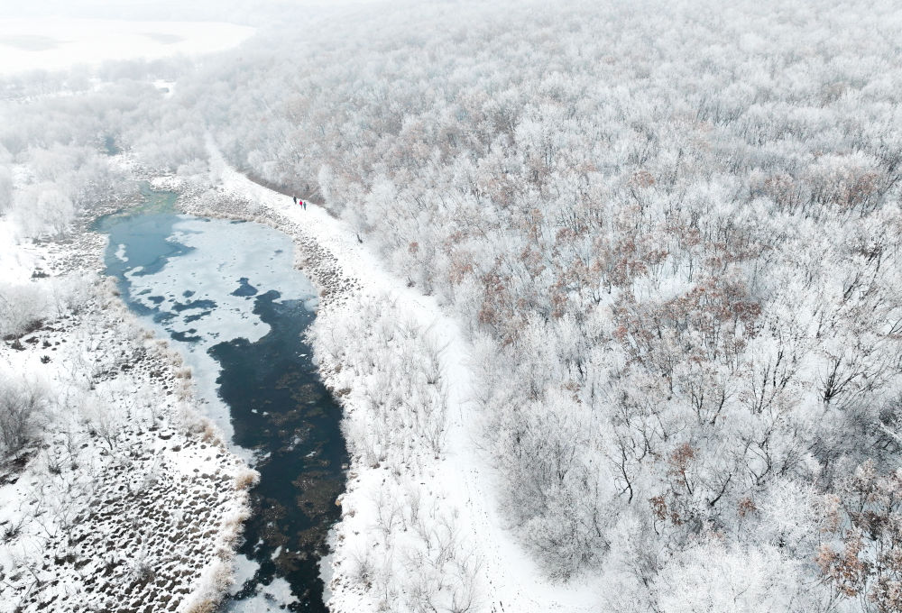 這是11月14日在莫力達(dá)瓦達(dá)斡爾族自治旗拍攝的雪后霧凇景觀(無(wú)人機(jī)照片)。新華社記者 連振 攝