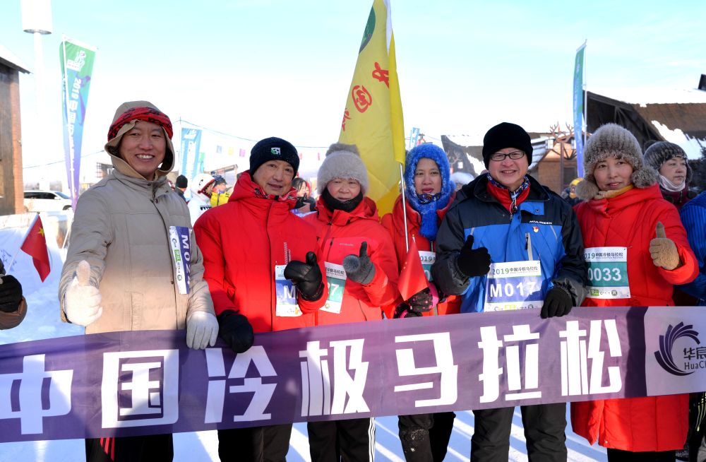 資料圖:2019年12月25日,參賽選手在冷極馬拉松開跑前合影留念。新華社記者 徐欽 攝
