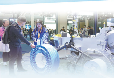 第七屆中國國際進(jìn)口博覽會(huì)上,觀眾正在了解米其林月球探測(cè)車輪胎?!√?克攝