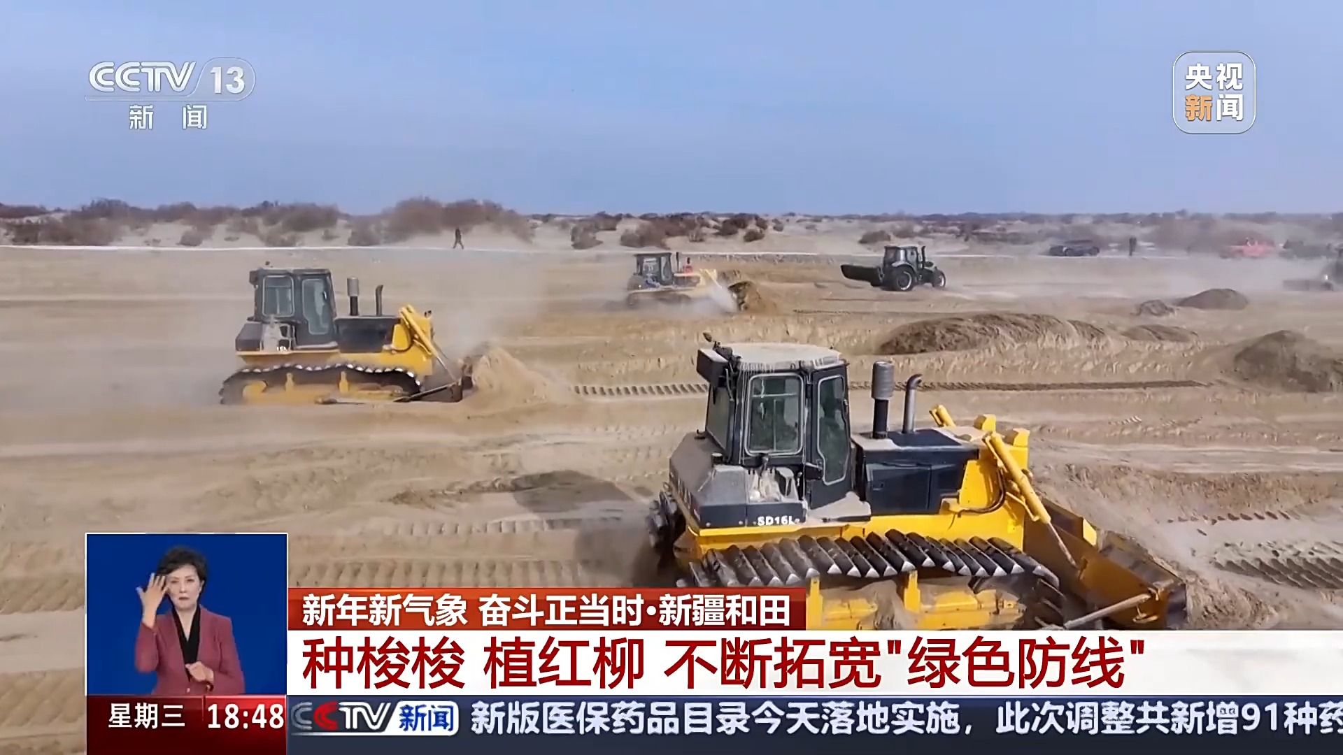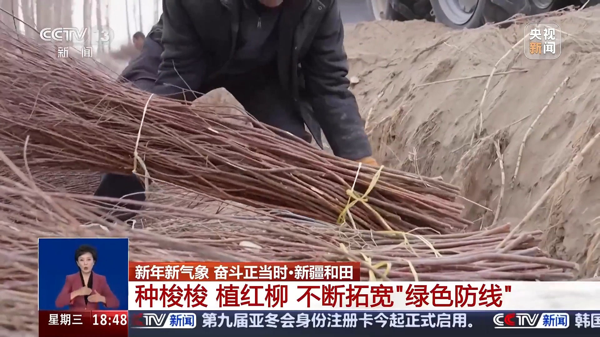 總臺(tái)記者 高鵬飛:這里是塔克拉瑪干沙漠南緣的和田于田縣,這兩天沙漠里面迎來了一場(chǎng)降雪,這會(huì)氣溫在零下10℃左右,非常寒冷,但是,在我旁邊就是一處熱火朝天的沙漠治沙現(xiàn)場(chǎng)。