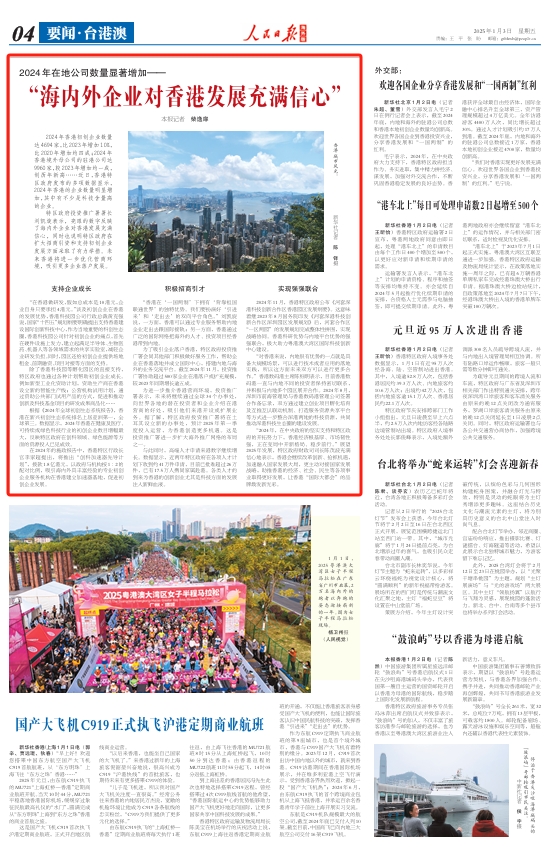 “2024年,在中央政府的堅實支持和特區(qū)政府的開拓努力下,香港經(jīng)濟根基厚、市場韌性強,正在變局中開新格局、穩(wěn)步前行?!闭雇?025年發(fā)展,特區(qū)政府財政司司長陳茂波充滿信心地表示,香港會繼續(xù)改革創(chuàng)新、搶抓機遇,加速融入國家發(fā)展大局,更主動對接國家發(fā)展戰(zhàn)略,助推香港的經(jīng)濟、社會、民生等各項事業(yè)取得更好發(fā)展,讓香港“國際大都會”的品牌煥發(fā)新光彩。