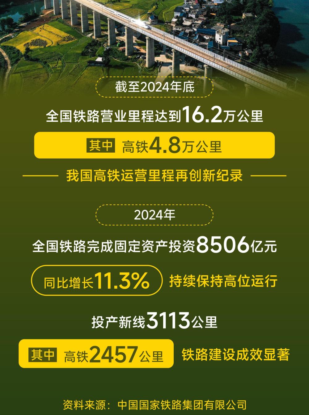 截至2024年底,全國(guó)鐵路營(yíng)業(yè)里程達(dá)到16.2萬公里,其中高鐵4.8萬公里,我國(guó)高鐵運(yùn)營(yíng)里程再創(chuàng)新紀(jì)錄。