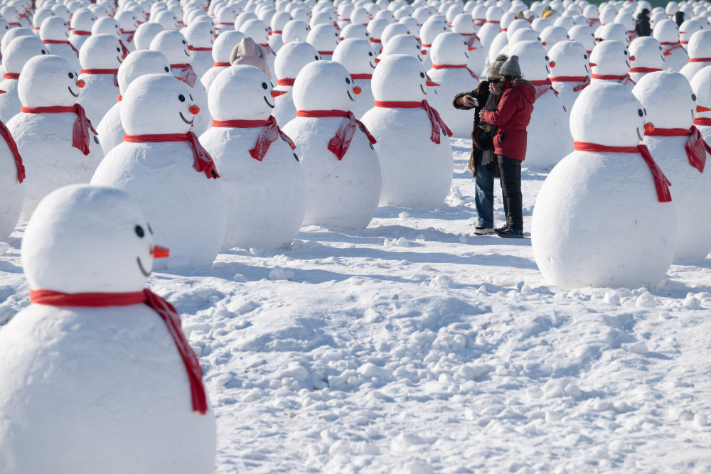 1月3日,在哈爾濱太陽島雪博會(huì)園區(qū)入口,游客經(jīng)過“雪人儀仗隊(duì)”(無人機(jī)照片)。