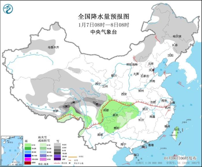 1月6日08時(shí)至7日08時(shí),內(nèi)蒙古中東部、黑龍江大部、新疆伊犁河谷和南疆盆地、西藏西部和東部、青海南部、川西高原北部、山東半島北部等地部分地區(qū)有小到中雪或雨夾雪,其中,新疆南疆西部山區(qū)、西藏西部等地部分地區(qū)有大雪,局地暴雪(10~16毫米)。西藏東南部、湖北西南部、重慶大部、貴州西北部、云南東北部、臺(tái)灣島東部等地部分地區(qū)有小雨。內(nèi)蒙古中東部、遼東半島、山東半島、浙江北部等地部分地區(qū)有4~6級(jí)風(fēng)(見圖1)。