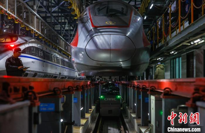 圖為修理庫中,工作人員清洗動車?!垥?攝