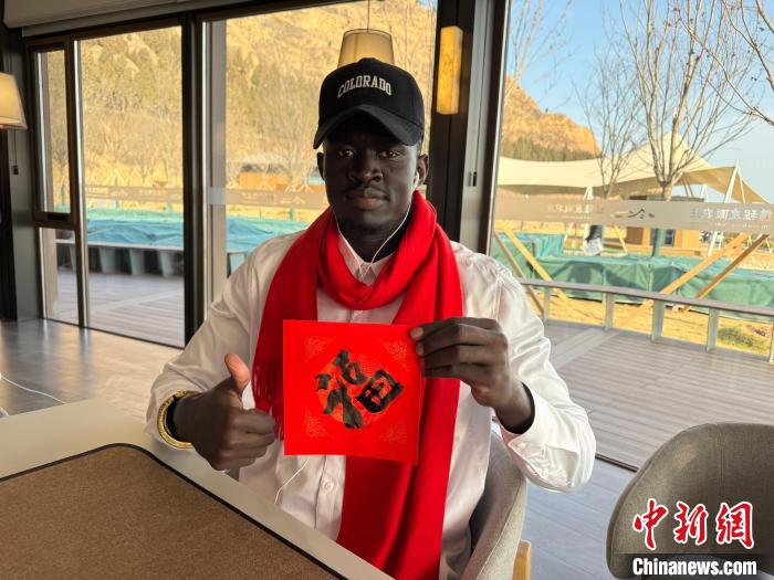 古奇展示自己寫的“福”。 郭峰 攝