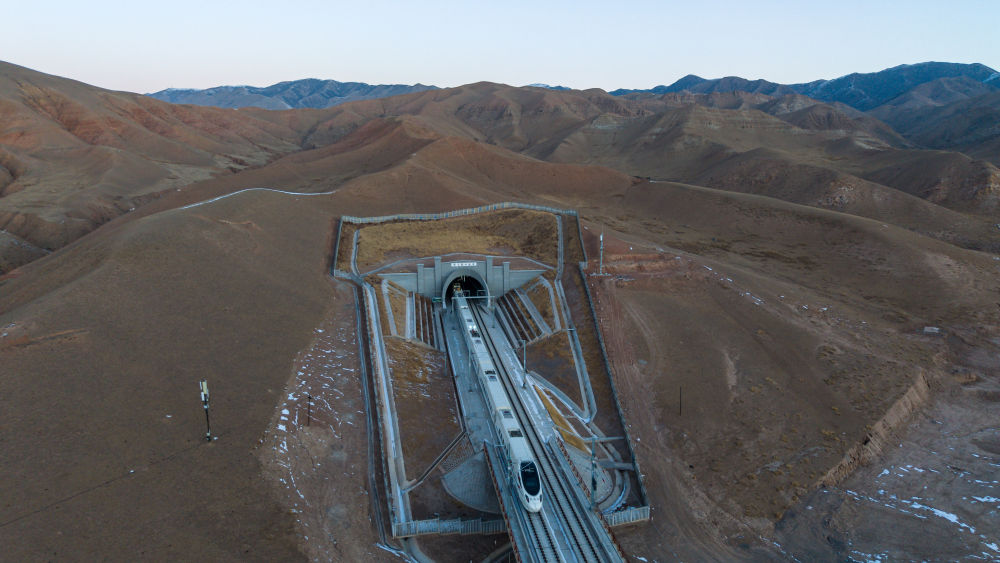 1月14日8時(shí)20分許,蘭州西發(fā)往武威東的D8885次動車組列車穿過新烏鞘嶺隧道。這是新烏鞘嶺隧道通車后迎來的首列春運(yùn)列車(無人機(jī)照片)。新華社記者 郎兵兵 攝
