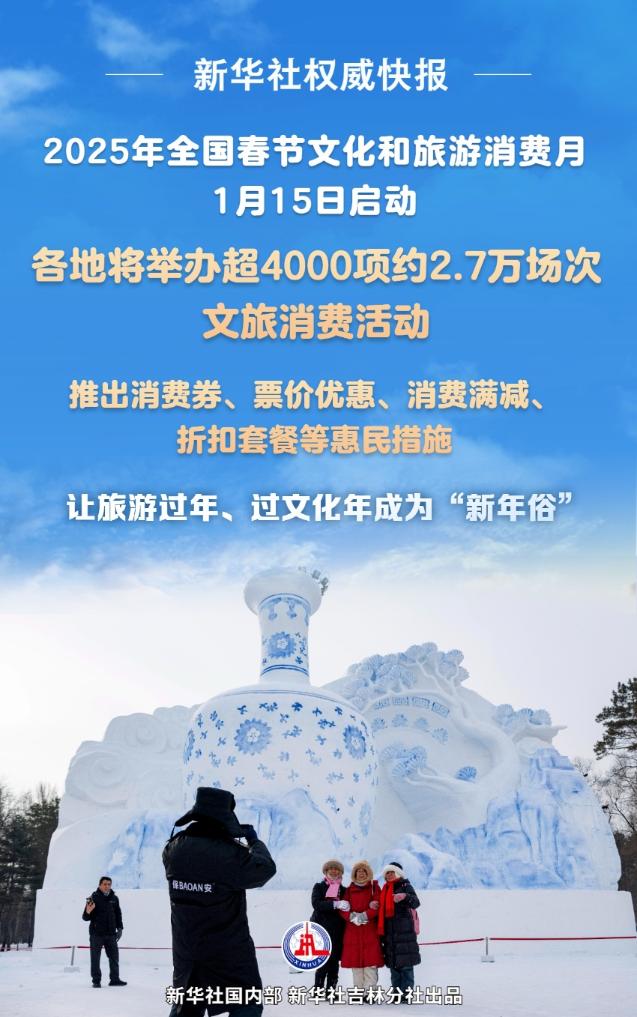 春節(jié)消費(fèi)月期間,各地將結(jié)合冬季及春節(jié)文化和旅游消費(fèi)特點(diǎn),圍繞過年民俗、美食、冰雪、避寒、康養(yǎng)、親子、研學(xué)、演藝、時(shí)尚、國潮等重點(diǎn)消費(fèi)需求,舉辦超4000項(xiàng)約2.7萬場次文旅消費(fèi)活動,推出消費(fèi)券、票價(jià)優(yōu)惠、消費(fèi)滿減、折扣套餐等惠民措施,帶來實(shí)惠便利的文旅體驗(yàn),營造歡樂祥和的節(jié)日氛圍,讓旅游過年、過文化年成為“新年俗”,為人民群眾春節(jié)假期美好生活賦能添彩。