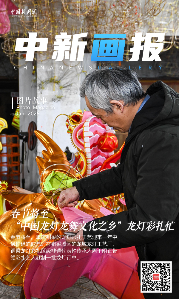 重慶銅梁區(qū)被譽為“中國龍燈龍舞文化之鄉(xiāng)”,銅梁龍燈彩扎是當?shù)匾环N以龍文化為主題的燈彩藝術(shù)。2021年,銅梁龍燈彩扎被列入國家級非物質(zhì)文化遺產(chǎn)代表性項目名錄。銅梁龍燈彩扎以竹子和鐵絲為骨架,經(jīng)過扎制、裱糊、彩繪、整裝等繁復(fù)工序,最終呈現(xiàn)出栩栩如生的龍燈形態(tài)。春節(jié)將至,重慶銅梁的龍燈彩扎工藝迎來一年中最忙碌的時節(jié)。在銅梁城區(qū)的龍城龍燈工藝廠,銅梁龍燈彩扎區(qū)級非遺代表性傳承人周千明正帶領(lǐng)彩扎藝人趕制一批龍燈訂單?!坝捎邶垷舨试廊槐A魝鹘y(tǒng)的手工制作技藝,一條長約30米的龍燈,需要五名彩扎藝人花費近一周的時間才能完成。”周千明表示,每一條龍燈不僅是一件藝術(shù)品,更是一種文化的象征,其承載了傳統(tǒng)工藝的傳承與發(fā)展。圖為1月14日,周千明在裱糊龍頭。