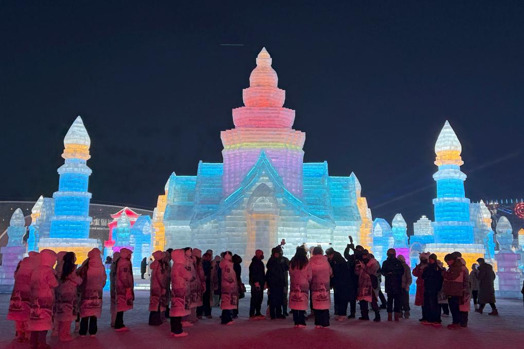 2024年12月26日,游客在哈爾濱冰雪大世界園區(qū)內(nèi)拍照游玩。新華社記者楊思琪 攝
