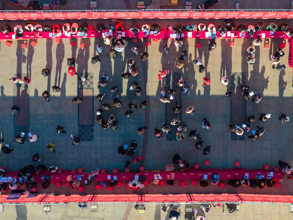 2025年1月15日,求職者在招聘會現(xiàn)場了解招聘信息(無人機(jī)照片)。新華社發(fā)(阮雪楓攝)